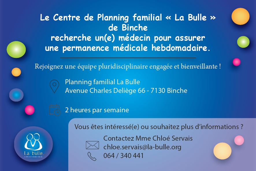 Lieu : Planning familial La Bulle – Avenue Charles Deliège 66, 7130 Binche